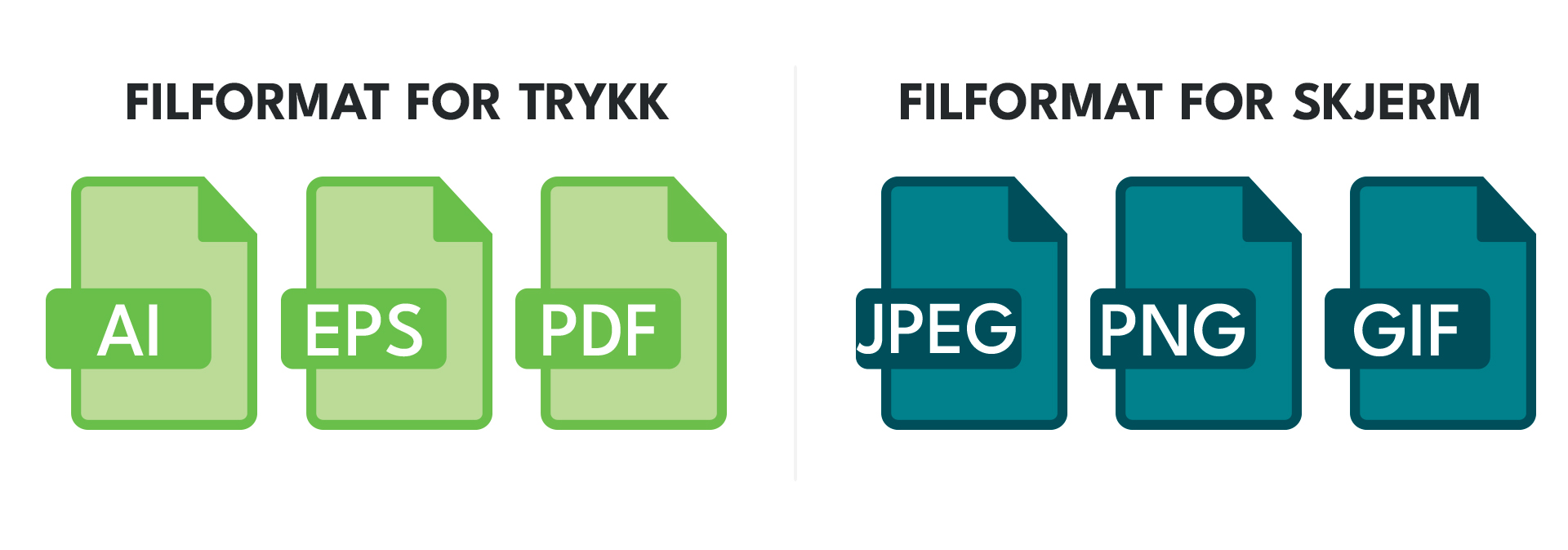 For å trykke logoen din, vil vi trenge trykkfiler som ofte er i filformatene AI, PDF eller EPS. Disse filformatene er vektoriserte, det betyr at filen er bygget opp av vektorpunkter som gjør at filen kan produseres i hvilken som helst størrelse uten tap av kvalitet og skarphet.
